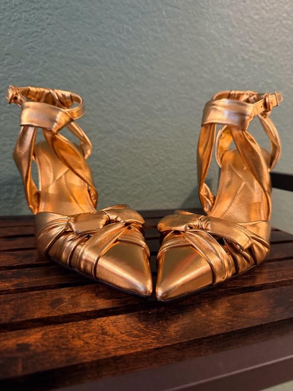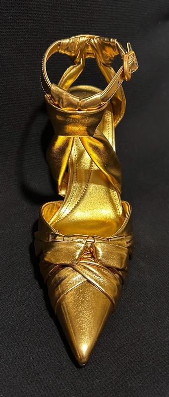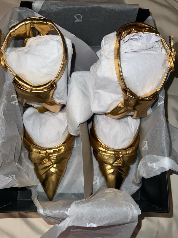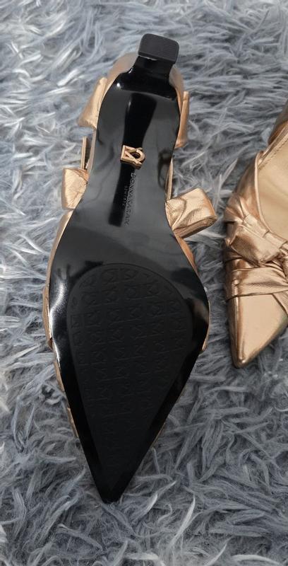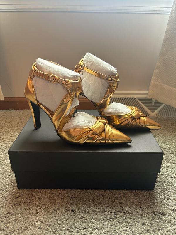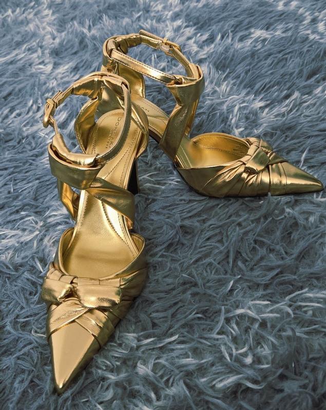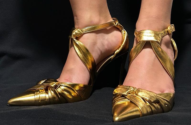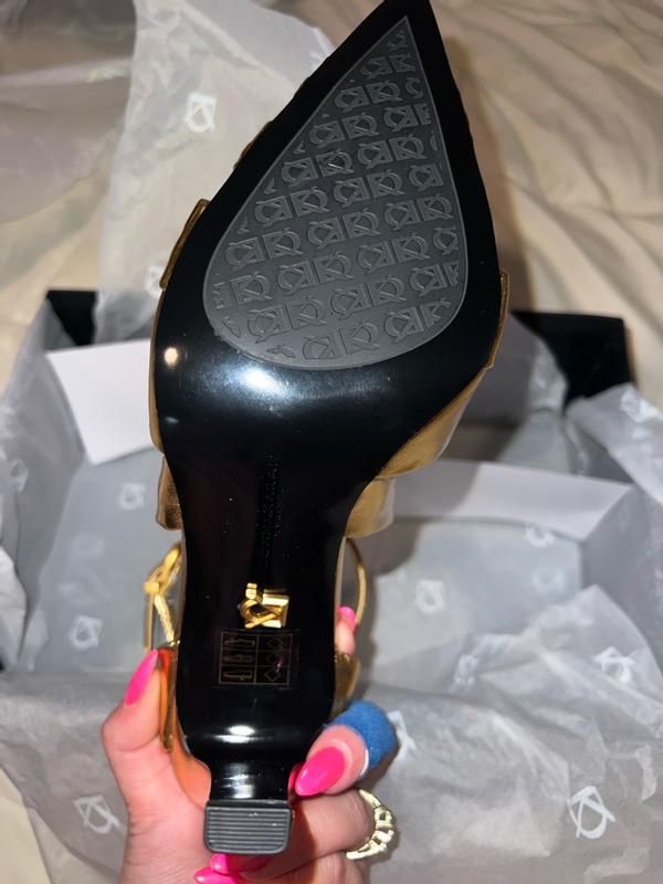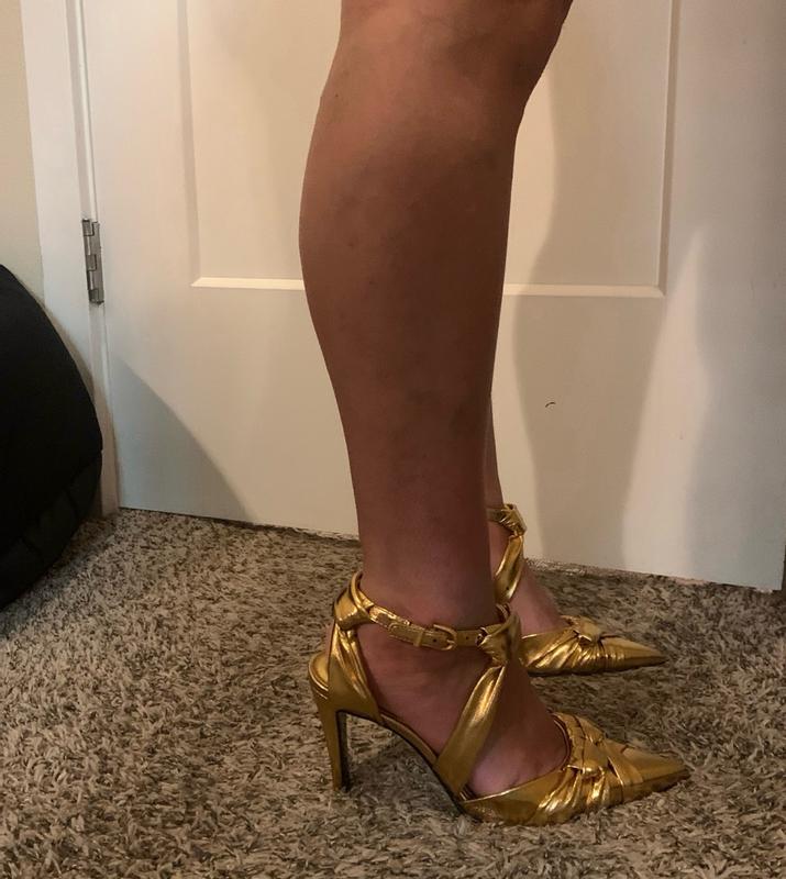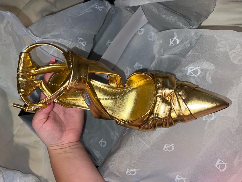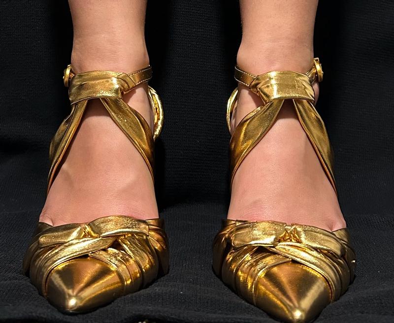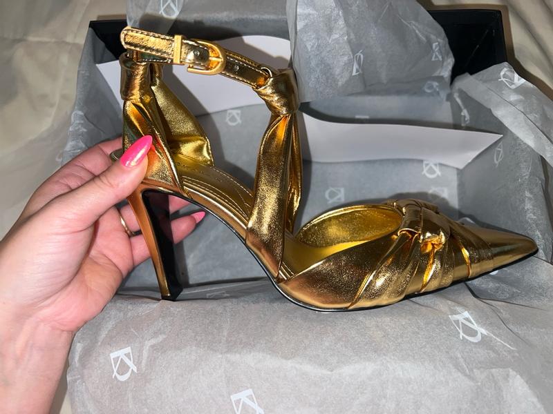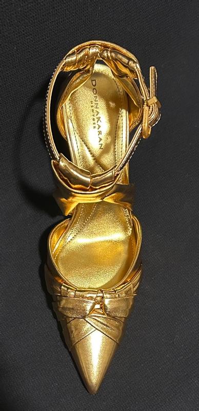 These Donna Karan Gold Phia Strappy Pumps are absolutely gorgeous. From the moment I opened the box, I was impressed. The packaging was elegant, with tissue paper and careful wrapping that made it feel like a true luxury purchase. The shoes themselves are stunning. The metallic gold finish catches the light beautifully and the strappy design feels both modern and timeless. The straps are well-crafted and the soles are smooth yet provide just enough grip. These shoes do not slip or slide, which gives added confidence when walking, especially for someone like me who doesn’t wear heels on a daily basis. I did notice a couple of loose threads fresh out of the box. They are minor, but at this price point, I would expect them to be flawless. I’m not sure if it says anything about long-term quality, though. As for the fit, they do run on the tighter side. The pointed toe shape caused my toes to rub quite a bit, and my pinky toes were very red and starting to blister, which could have been worse if I had worn them longer. I wore them for a couple of hours to a concert, but we were seated most of the time, so they were mostly comfortable. They may just need to be broken in, but I would say they are more of a statement heel for special occasions rather than something you would want to wear to work or all day, unless you are very experienced and comfortable in heels. Overall, they are high-quality pumps that are bold and sexy, yet still elegant and timeless. They make a great statement piece for your wardrobe and can be dressed up for a night out or paired with a more casual outfit for a stylish touch