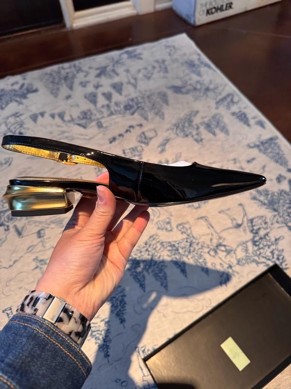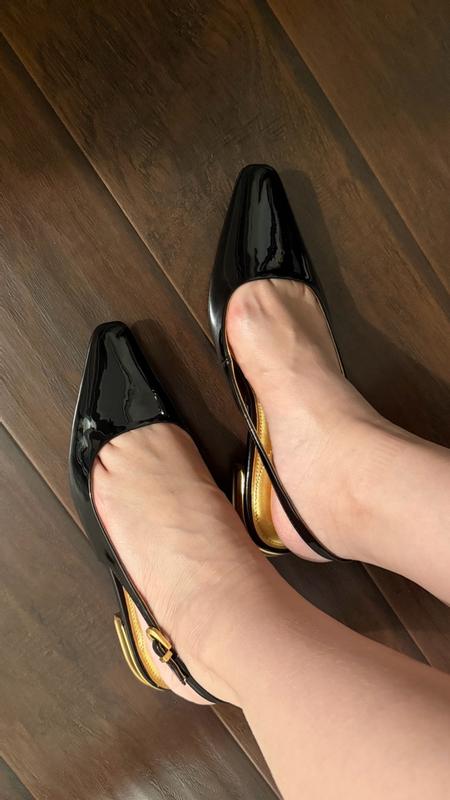Stiff material that will dig into your feet after a long wear time. The gold and black combination is super cute and the material feels strong so hopefully it won't get scuffed up. I like the strap on the back because a lot of heels with this stiff material tend to dig into the back of my ankles but the strap doesn't do that as much or it doesn't irritate as much. I have wide feet so it doesn't look the best when viewing the shoes from above but the heel is just high enough to give height and that taller vibe with it being low enough that you can still be comfortable for longer.