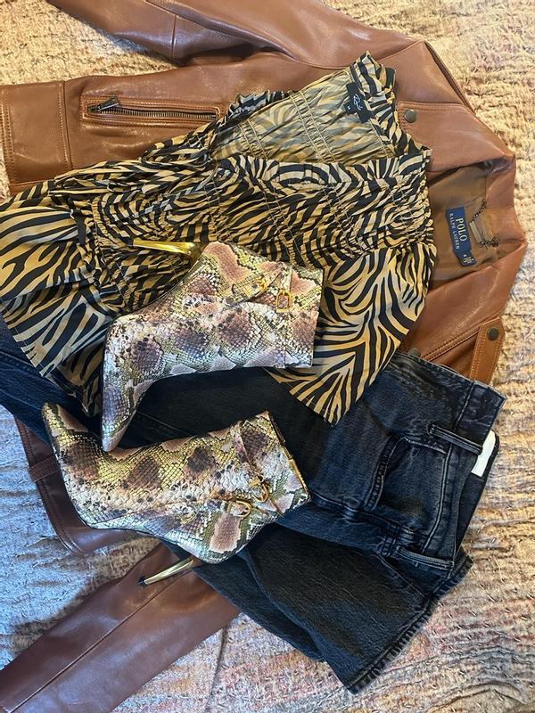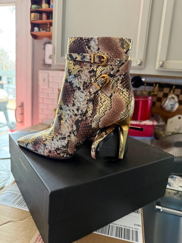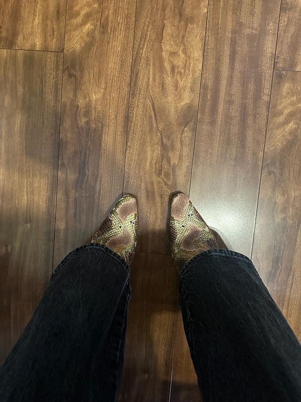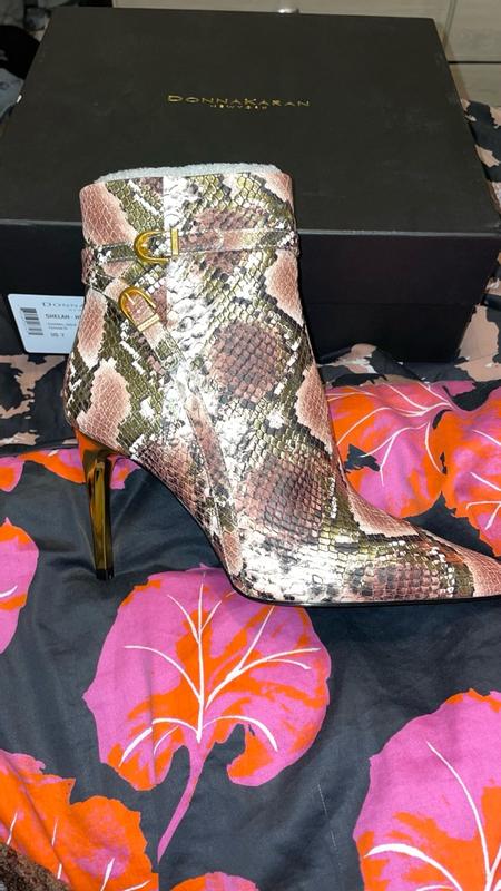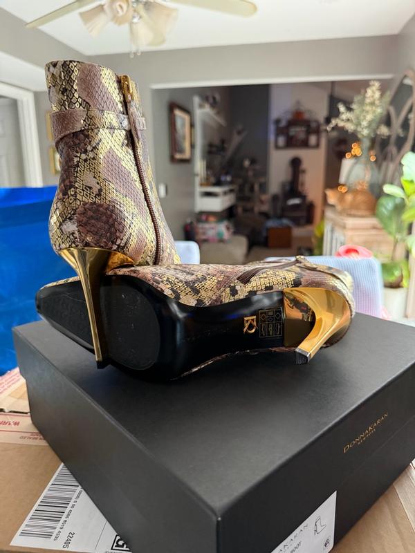These boots are exactly what I was looking for. Very 90’s. Love the silhouette. Very Donna Karan. The snakeskin is cute. Gold looks chic, not cheap. True to size, but stiff. Thin socks work best. Could size up for thicker ones. Curious to see how they break in over time. Comfortable so far, can wear for hours. Pairs well with my whole closet. Only con is for the Donna Karan brand (not DKNY), I expected some leather, but these are fully man made. Still I love them and they’ll get tons of use. They’re well constructed and very stylish.