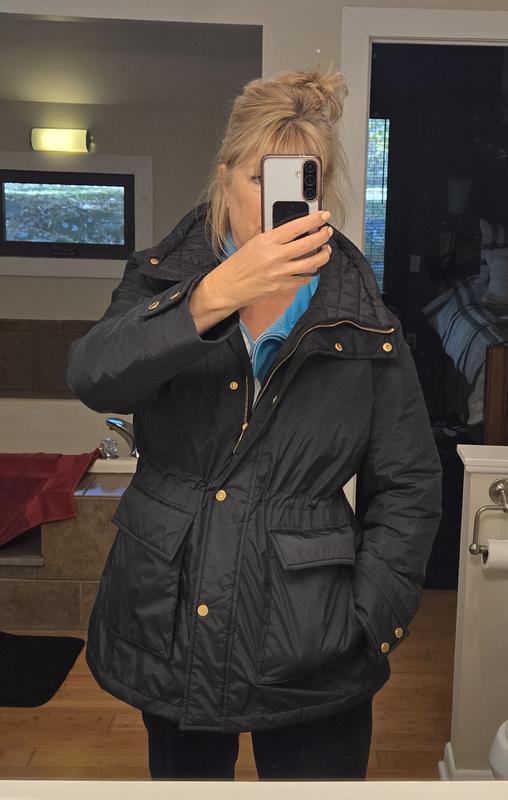 Very Stylish and warm without being overbearing. I love the gold hardware. It’s give the jacket an elevated look. I usually pick a winter coat with the anticipation of having a sweater underneath. So I don’t go by what I normally by as a size I see how it fits first. It’s so easy to just switch a size. I love it and I may buy the cream as well. Enjoy!!!