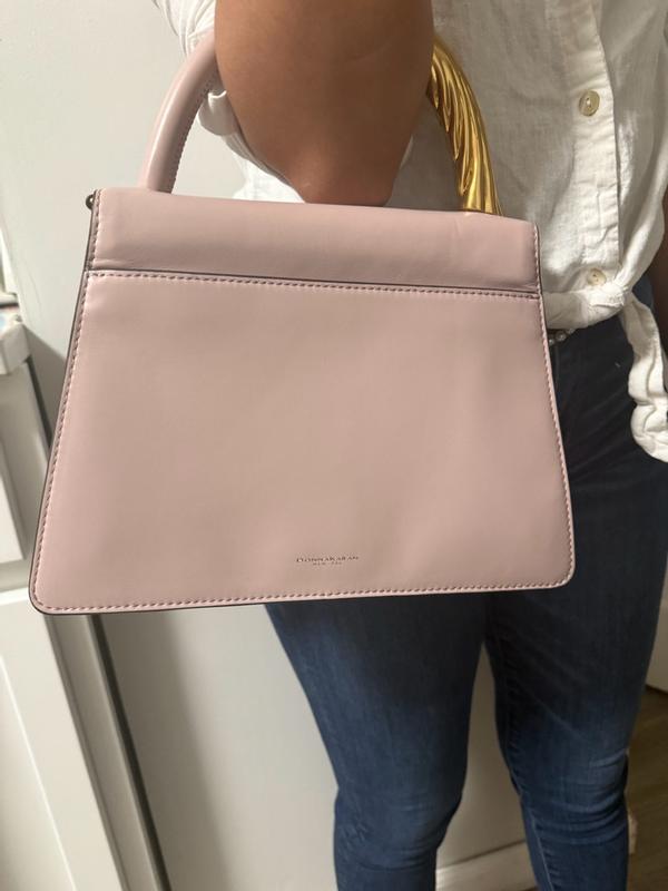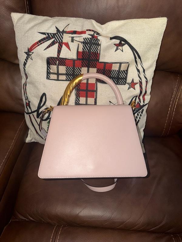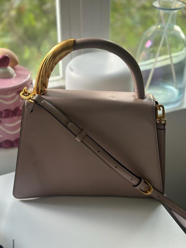 This is a beautiful bag. The leather is soft, and I love the shadow pink color, which I think will pair especially well with many of my black or gray winter ensembles. I also appreciate how easily it can go from a satchel to a crossbody with the enclosed strap. The gold-tone accent on the handle really adds a layer of elegance. Although this bag is on the smaller size, it can accommodate my wallet, phone and a few other essentials. I can definitely see myself using this bag for formal engagements and evenings out.