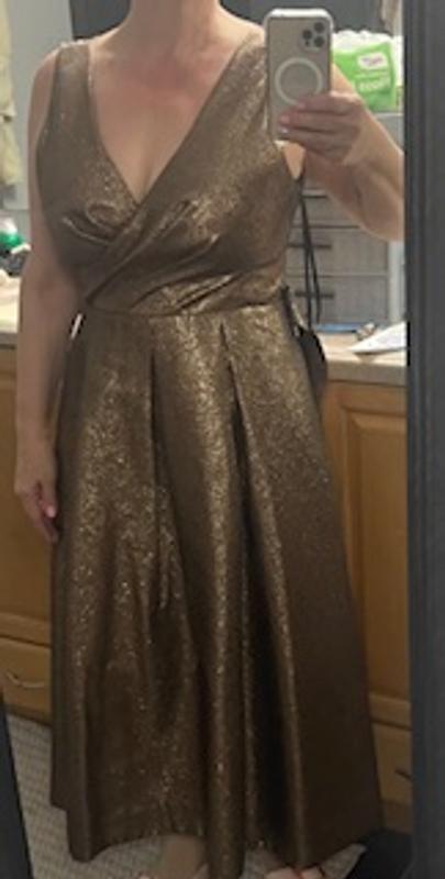 The cut, fit and style of the dress are great but the photos online show it shimmery, not glittery. it is very glittery and a bit over the top for my preference and although I love the cut and style I will be returning it as I am not a glitter-girl and this outweighs the cut and style for me.