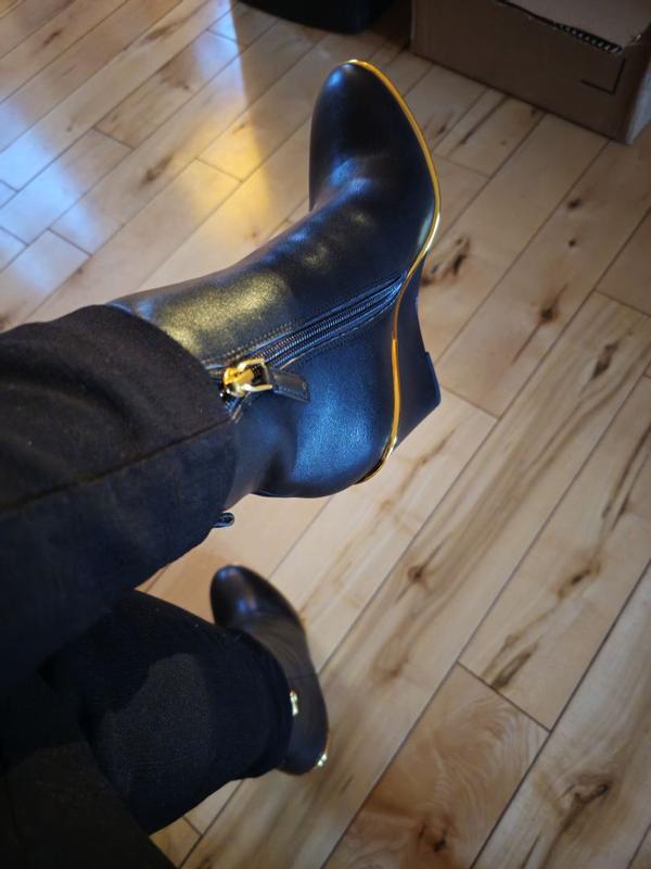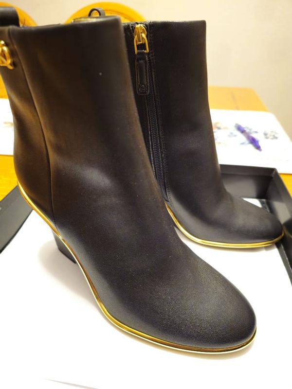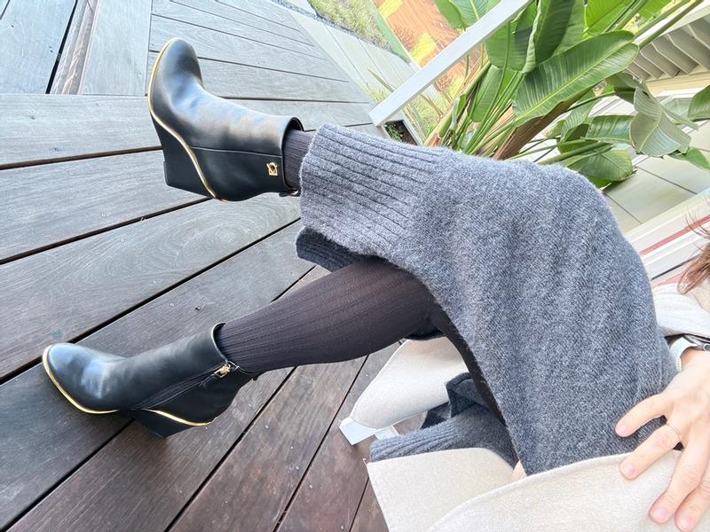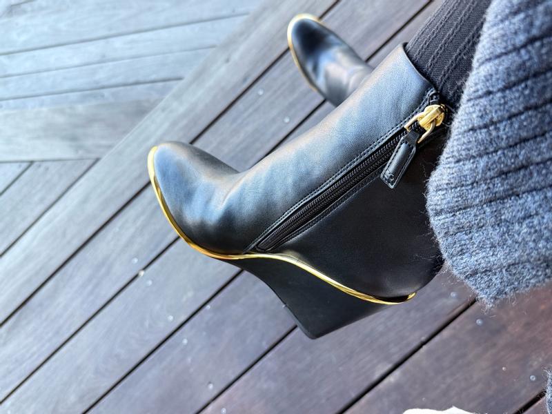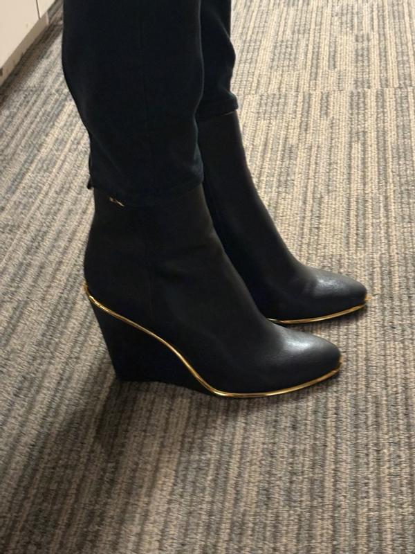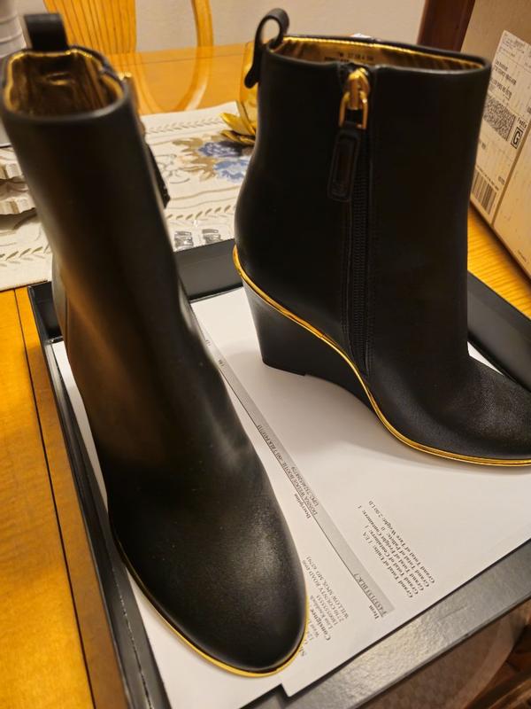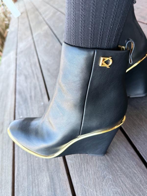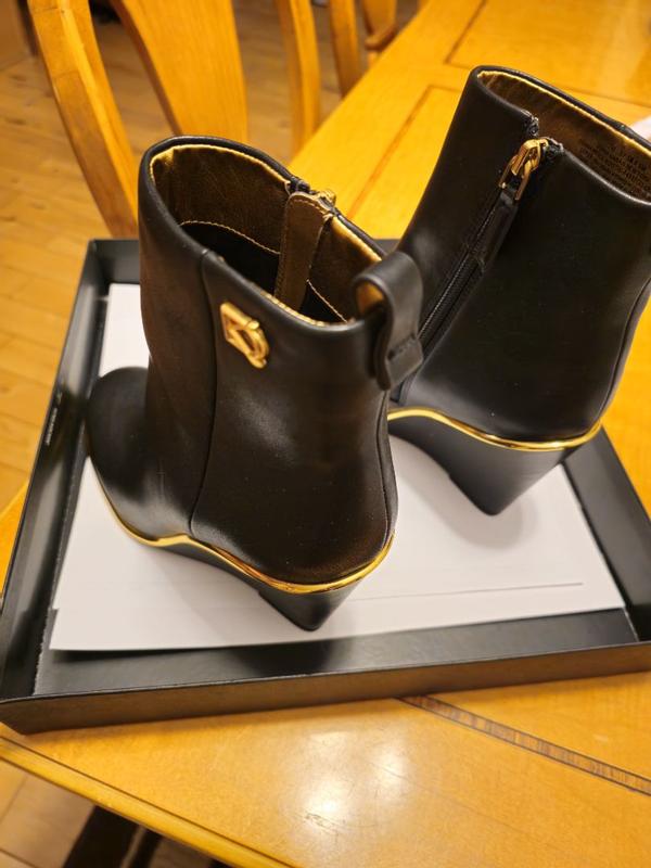 I absolutely love these Donna Karan ankle wedge boots. They look elegant and modern, with a beautiful gold detail that elevates the entire design. The leather feels high quality and soft, and they fit true to size. They are surprisingly comfortable for a wedge. I can walk for hours without discomfort, and the height gives a nice lift while still feeling stable. Very versatile, they work great with dresses, skirts, or pants.