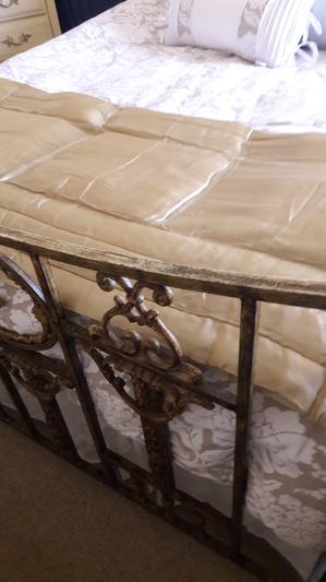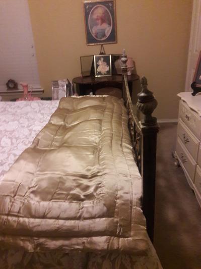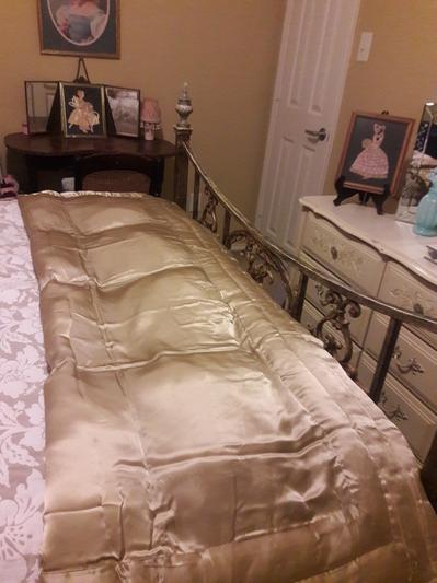 For a humble throw, it's pretty stunning. Metallic gold silk makes for a lovely accent piece on your on-trend champagne-colored bedroom. It's generally impractical and you could buy two or three cotton coverlets for the price, but there are some benefits worth considering. It warms up immediately: as soon as you wrap it around your body, you're instantly cozy. It's a little magical in that regard. It's stylish, in trendy colors, and well-made with baffle construction. The filling is polyester down alternative. I dropped one star for it being dry clean only, which makes it unnecessarily fussy for real-world use; even hand-washable silk would be an improvement. But if dry cleaning (and its price) isn't an issue for you, I think you'll be delighted.