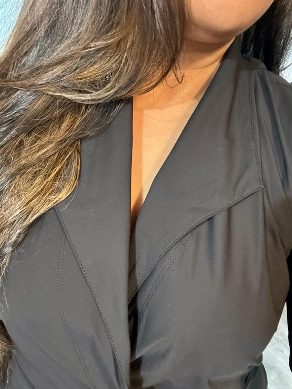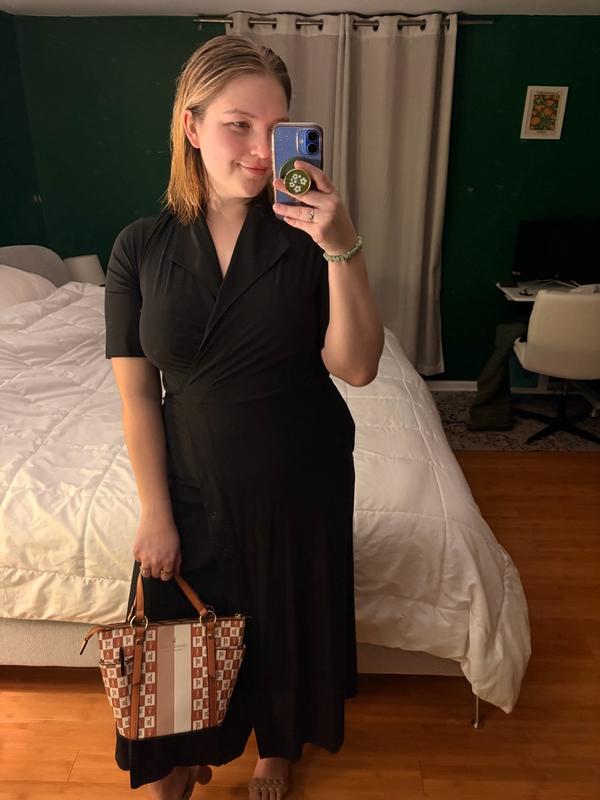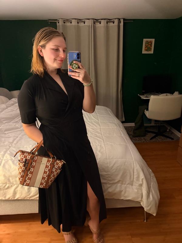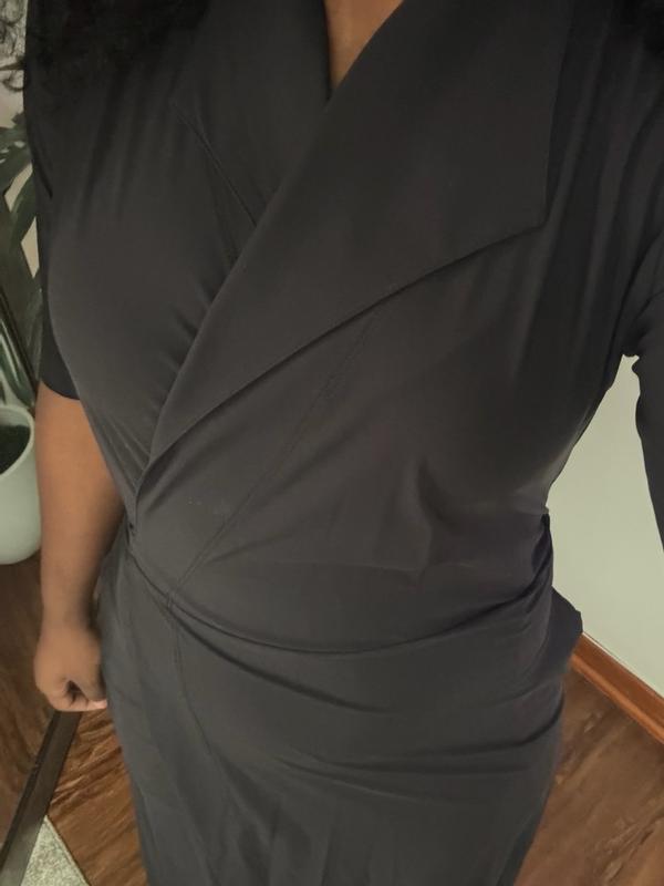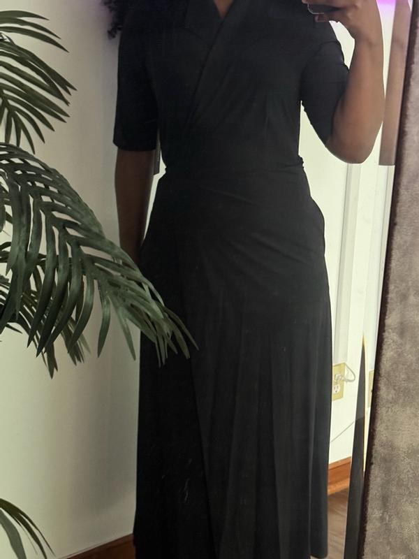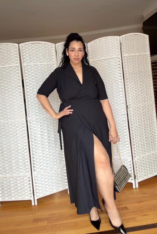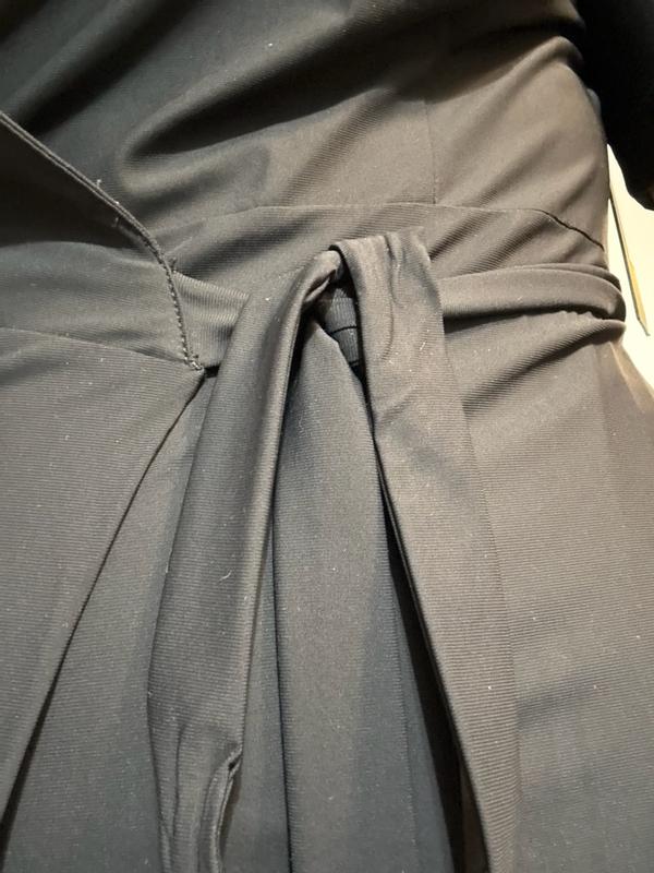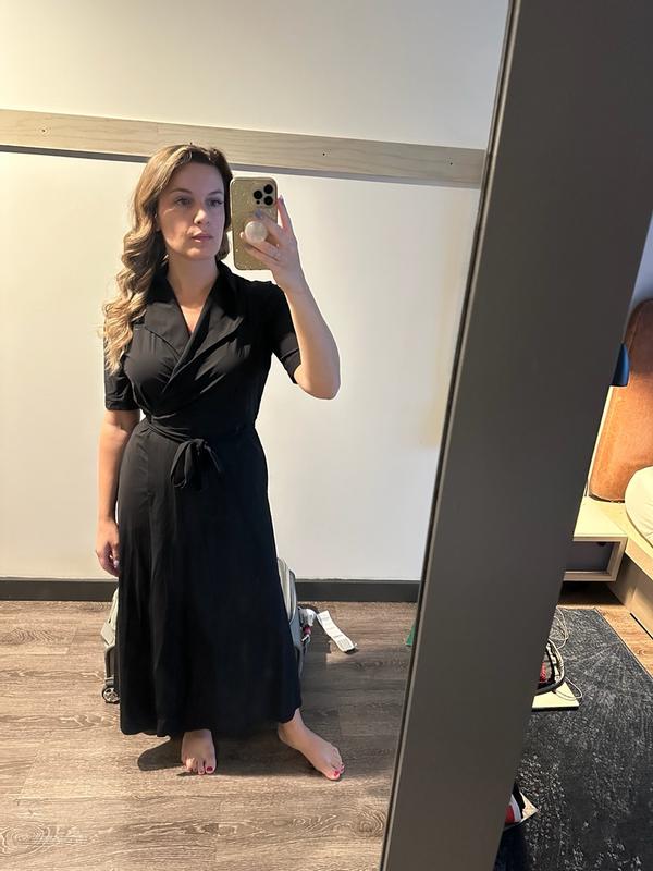 The perfect work or cocktail dress. It comes down almost all the way to the ankle and it’s such great quality not too think and not too think. The perfect wrap dress and provides coverage for you. The dress is easy to tie with one tie going inside and the other wraps around your waist. Super comfortable and super versatile.