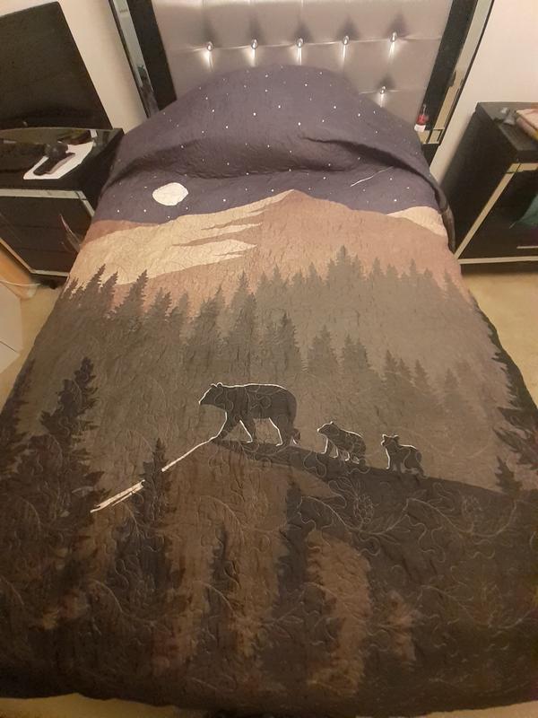 I'm astin8shed in jow the quality of this king eize quilt is especially the stotching has made that clasoc youch but elegant look as one can imahine on camping grounds. The brears on the mountain at night you can see the viiew as if you were looking under the stars at n8ght looking at the moon. The pater of plaid outlin8ng 9f the quilt just brings back one to great grandmas quilt days. The coloring, shades, textures,of this mountain quilt set has will turn your room into an unique style that will get you wanting yo go out to camp. My boy's love the way this product looks and feels. This quilt will definitely be laid out onto my sons bed.