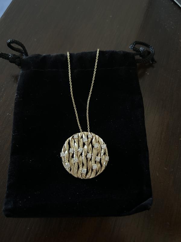 Absolutely outstanding piece of jewelry very highly recommended. It is luxurious and sits beautifully on the neck line. Made it eloquently. I also have the ring to match.