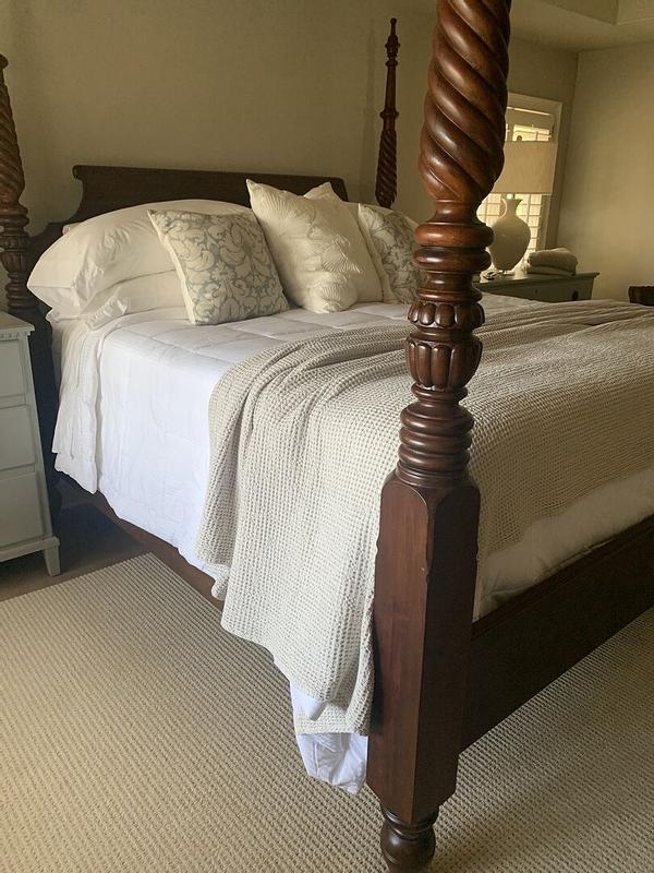 This blanket is the perfect size for our bed. Our bed sits rather high, plus the mattress is very thick, ordinary blankets never cover the boxsprings or hang down to the railings. This one is perfect hangs plenty long enough and it’s lightweight enough for our South Carolina weather I’m so glad I found this blanket.