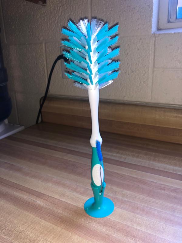 This is a must have in cleaning bottles. It is very easy to use. The angled bristle pattern is great to clean hard to reach areas. The ridges at the base handle is perfect for cleaning nipples. It can also be used to clean water bottles and hard to reach areas of water bottles. The suction on the bottom is great because it stays on the counter all the time. Really great for cleaning!
