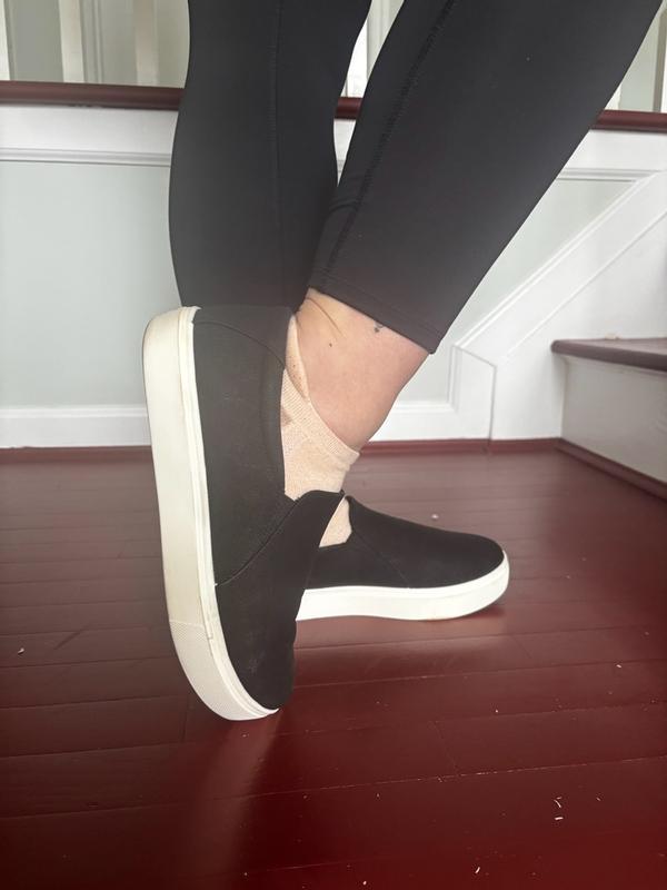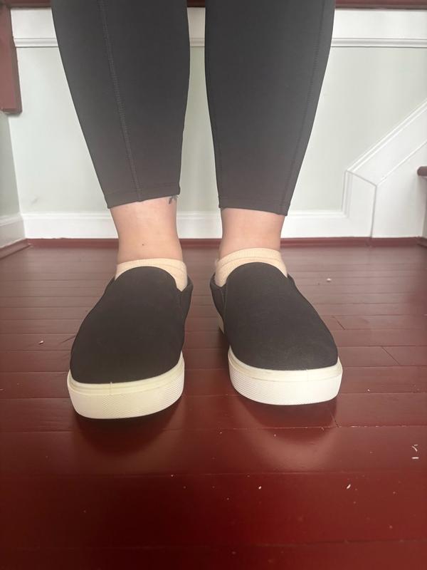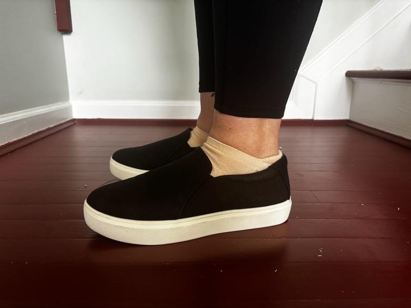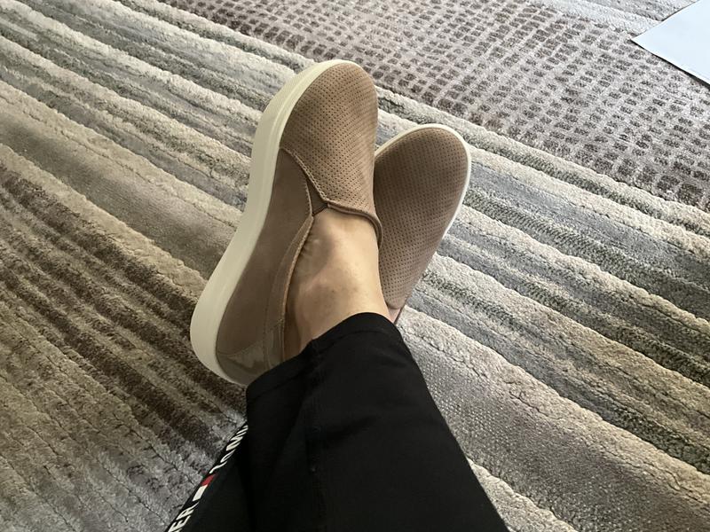 I bought my normal size, but I always add a Dr. Scholl’s Double-pillow memory foam insole for even more comfort. These are adorable platform slip ons to have on hand. I have the beautiful warm Taupe for a fall shade, and also the lighter Oyster, both in microfiber. My older pair were not the platform style, but the platform is the updated look that I’m now wearing.