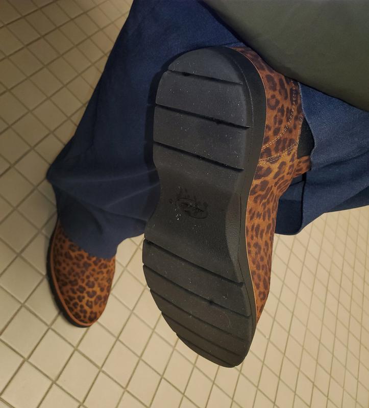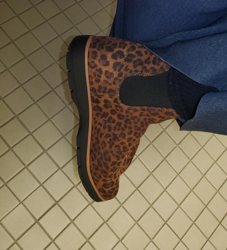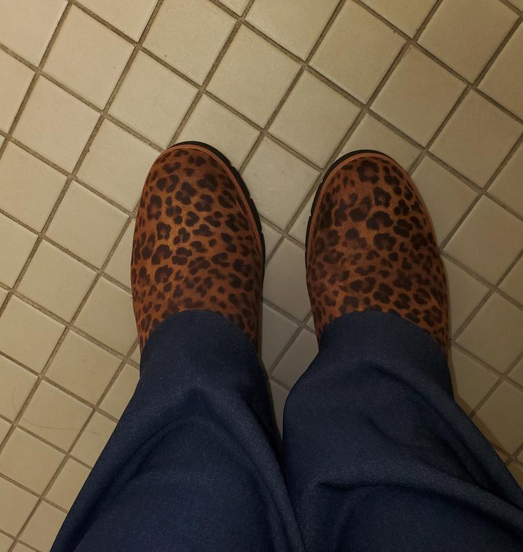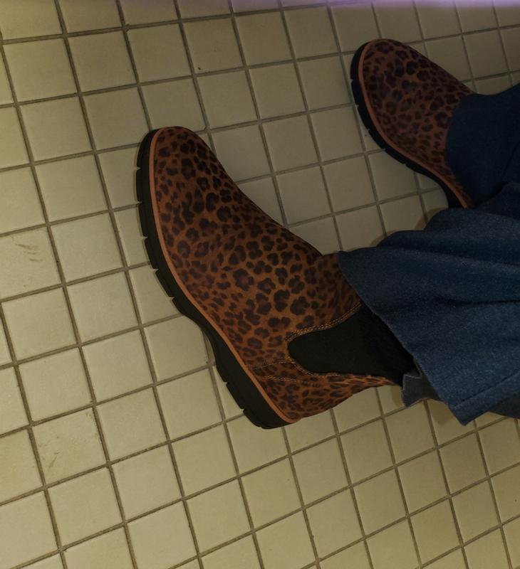 These boots are SO COMFY! and I LOVE that they are available in wide. I now have them in brown black and this cute faux animal print. I work on my feet and can wear them all day because of the cushy inside and rubber soul.