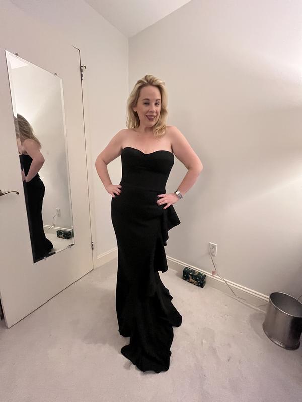 Have been a fan of Dress The Population for many years. This is my first long dress and it is beautifully made. The fabric is soft, nicely weighted and lined from the waist to knee. The four stars rating is due to the website's recommended size (XS) from previous dress purchases. However, it is too small--zipped halfway--even with a little stretch in the material. I am 5'2' and 122 lbs. Bonus, the length is perfect with 3/12 heel and there are two straps offering another style should you desire.