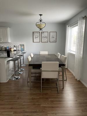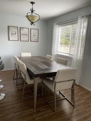 Metal base dining chair offers a lower profile back that gives a more upscale contemporary feel