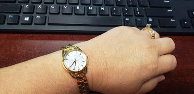 Very beautiful watch. I wish the dial was a little bigger, but its not too small either. I got the size adjusted at the Macy's store. I also received a citizen alarm clock as free gift which is super awesome! I am very satisfied with my purchase.