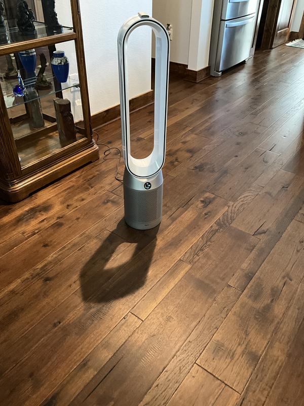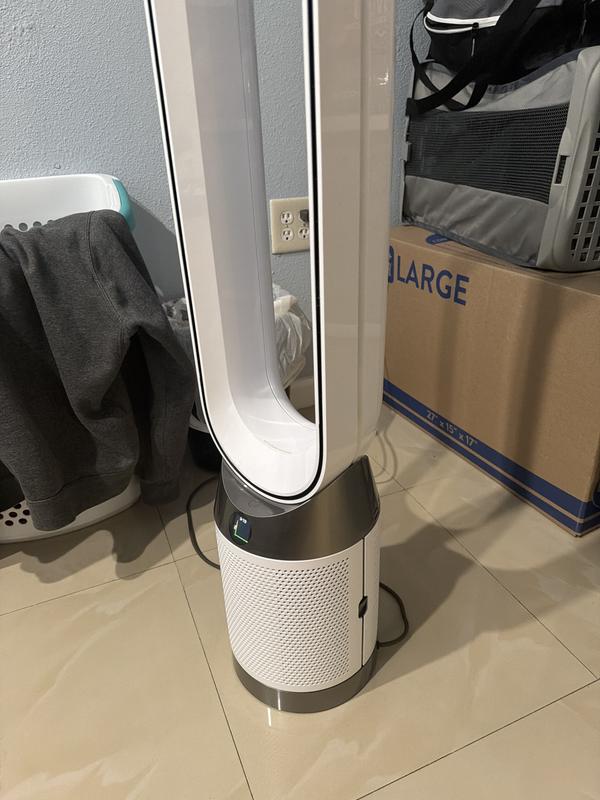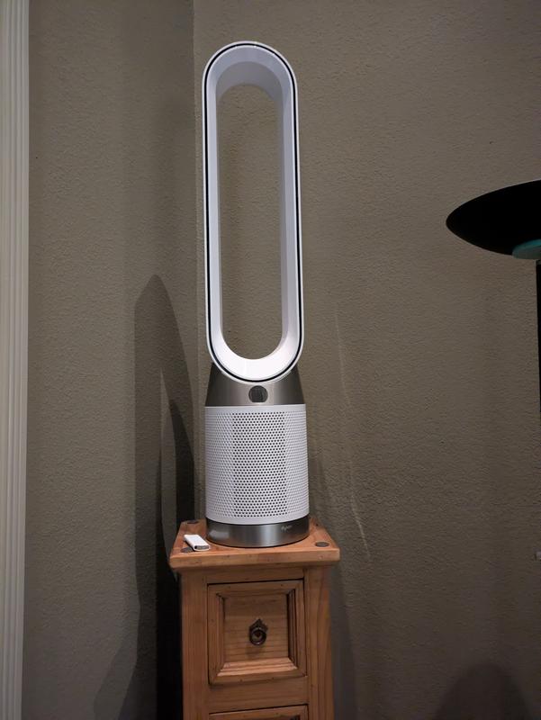 I run it in auto and it is quiet and sensitive; if someone smokes in the same room, it goes to full speed until the air is clean again. You control it with a remote, you can also download the Dyson app and control it remotely that way. The design works like an air ejector by using a small fan to entrain a large volume of air through the elliptical ring.