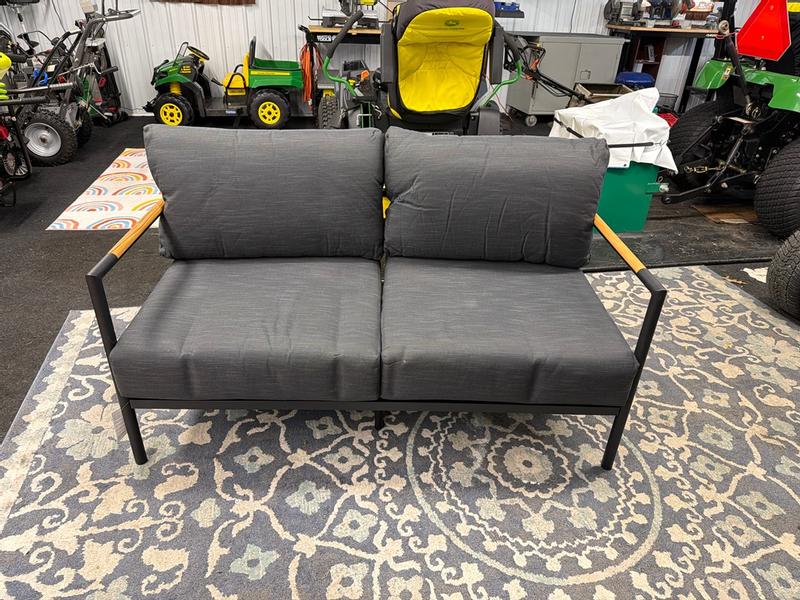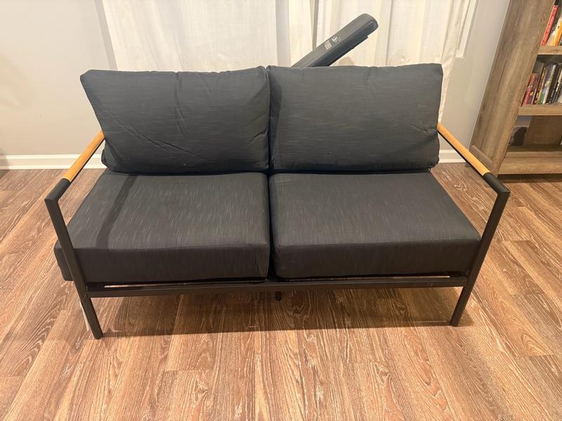 Eastport Outdoor Loveseat With Removable Plush Fabric Cushions And Teak Accented Aluminum Frame