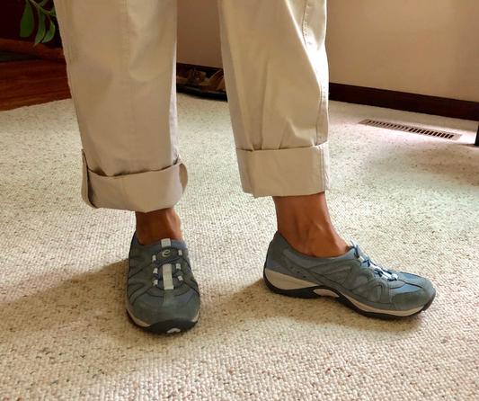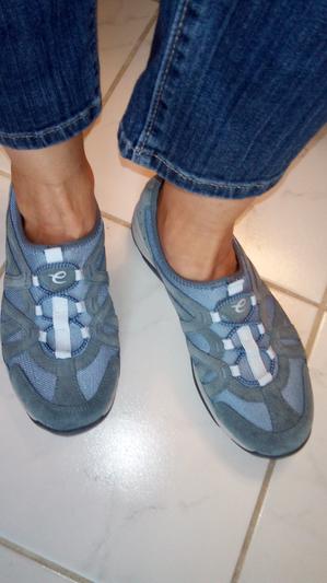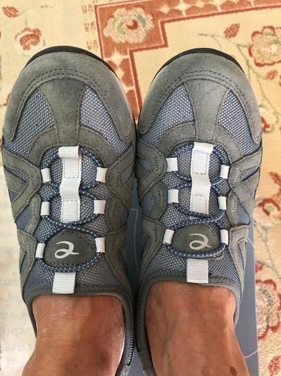 These sneakers fit well, were easy to put on, and looked good. Perhaps a bit short in the toe but not uncomfortable. If you are a serious hiker I think your feet would get tired, but these are perfect for a long day of walking and shopping. The color is a great neutral blue match for jeans.