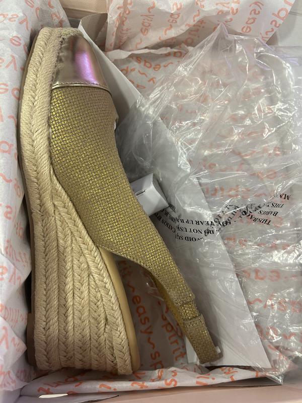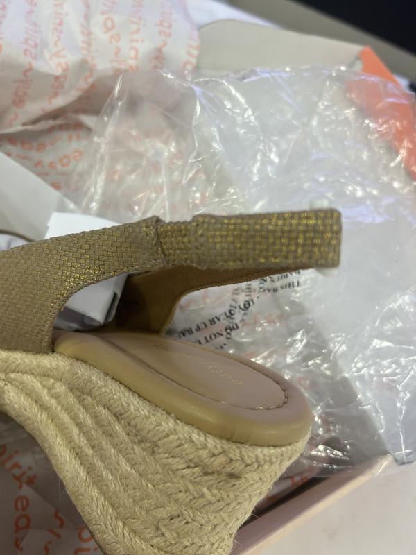 I got these espadrilles last summer, wore them nonstop and they still look new! Fashionable, super comfortable, perfect heel height, great with slacks, jeans, shorts, skirts. If there is a gold tinge to the fabric, it's very subtle, so I don't agree at all with the review that the entire shoe is gold. HIGHLY recommend.