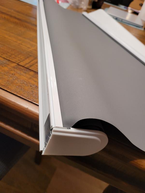 When I got my shade the box was pretty beat up but everything was good inside. The material was thin but still good. I choose an inside mount for my roller shade, which I later regretted. Our window itself, the frame is pretty small so at the top where it connects to the inside of the window leaves about 1” of light coming in. The shade did cover to the edges well with minimal light coming thru though. It would have been better if I ordered the outside mount. We liked nice darker grey color of the shade and matched our room well. The roll up wheel is quiet and kind of slow which we like. Not sure if it will get faster over time and use. . Also, there is about 4” of curtain hanging down even when fully up. I did not like the pull handle that came with it and thought it was useless. The only thing I do wish it had was a top headrail so that the light wouldn’t come thru the gap at the top from the mounting.