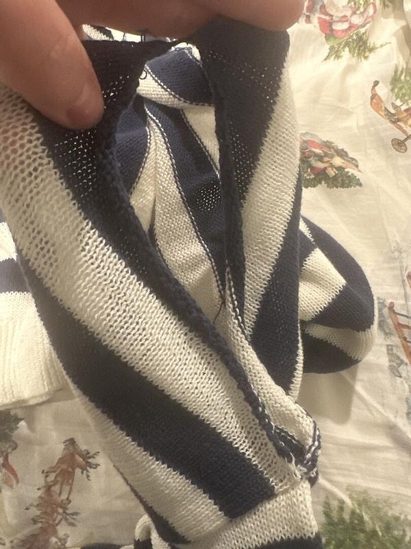 Beautiful sweater but came ripped down the neck and sleeve. I would like a replacement please.