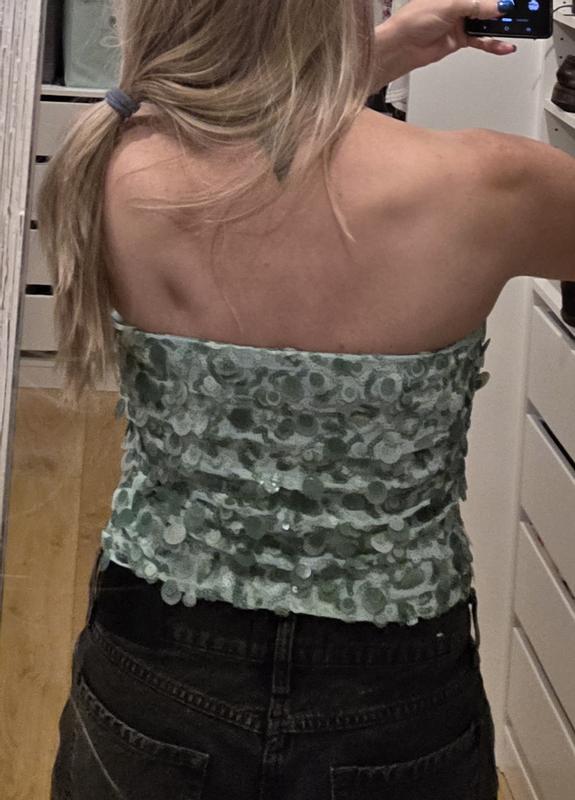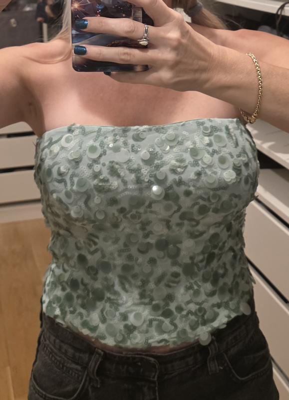 This beautiful sequin blue top is long enough to cover my stomach. The top is lined with a rubber strip to help keep it secured to your chest. Its also thick enough to not need a brah, which is nice.