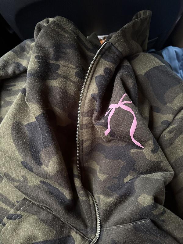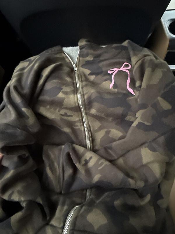 This hoodie was disappointing the material is on the cheaper side not as expected for the price and I got a medium cuz it said oversized and it more like above my hips not over or below them and its not the lookI was going for. Loved the camouflage and pink Edikted bow combo but will return unfortunately
