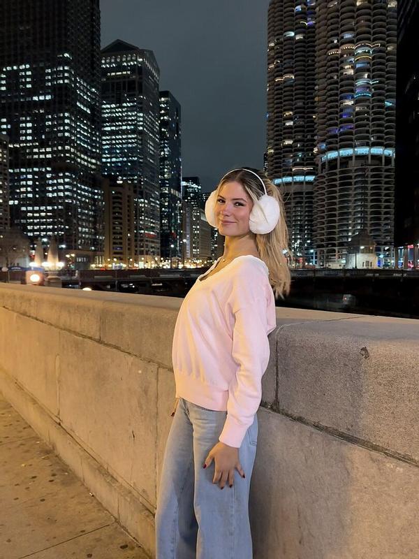 This sweater has the cutest lace v neck and is the most gorgeous pink color! I love the quality of this sweater and how cozy it kept me in the chilly Chicago weather!
