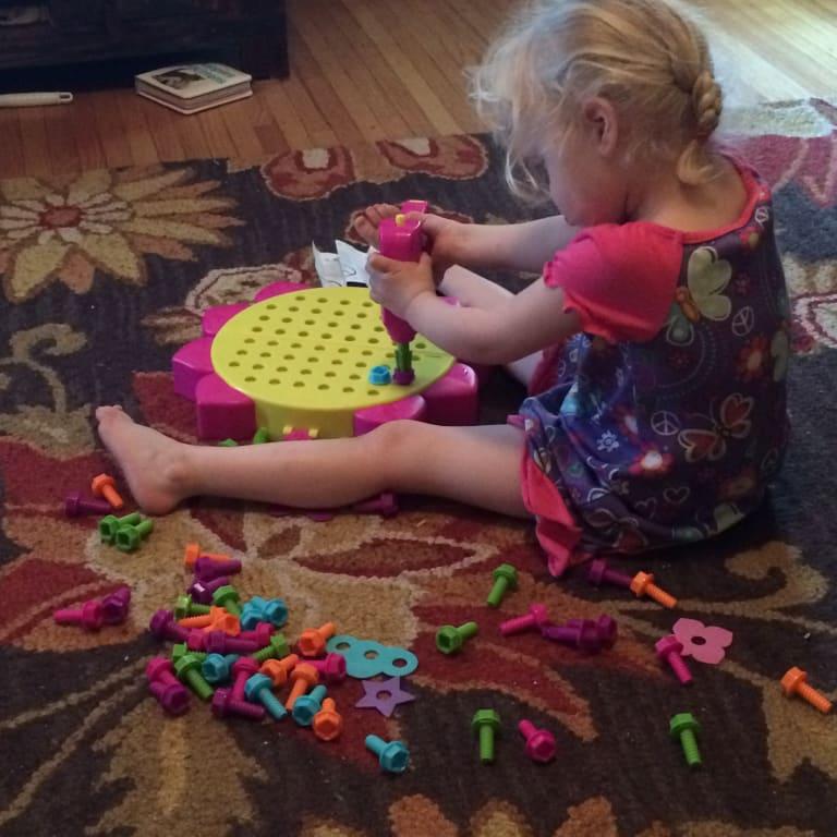 My daughter really likes this toy. The flower case opens up flat to create a drilling board and she loves drilling in the pieces and making pictures with the different screws and flat plastic pieces. Her older brother even gets out his toy drill and they drill little pictures together. It would be great if everything (the drill, screws, and flat plastic pieces) all fit inside the case for easy clean up. It *almost* does, but not quite, so I keep all of the screws in a gallon ziptop baggie. Other than that, this toy has been well loved for several months now! She started playing with this at 4yo and still enjoys it as a 5yo. I think that's a perfect age for this toy. I also think it's great that there are toy tools specially made to appeal to girls to encourage these types of activities long dominated by boy-centric toys. Girls can use tools, too :)