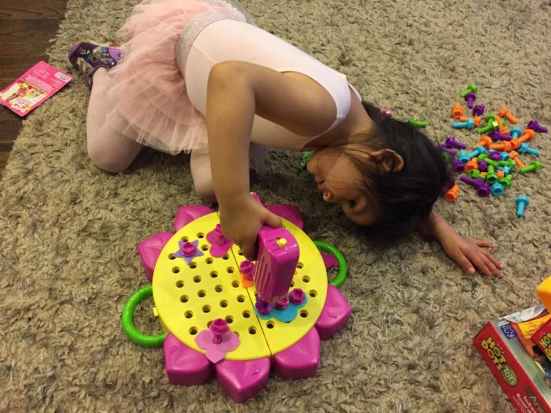 My daughter was never very good with patience, but I have noticed with this toy she will sit and play and take her time. She has gotten the hang of the drill switches and is very proud of herself when she put something together. Definitely a wonderful toy. Wish it had more little design plug ins like the butterfly and heart.