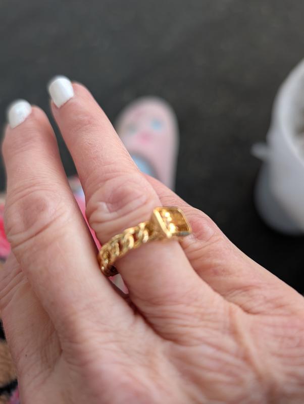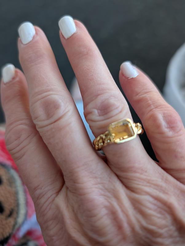 I love this ring. Stylish and light weight, with chain details around the band, and a color of citrine that matches the plated gold. I purchased on sale, and what a deal. Go get one!