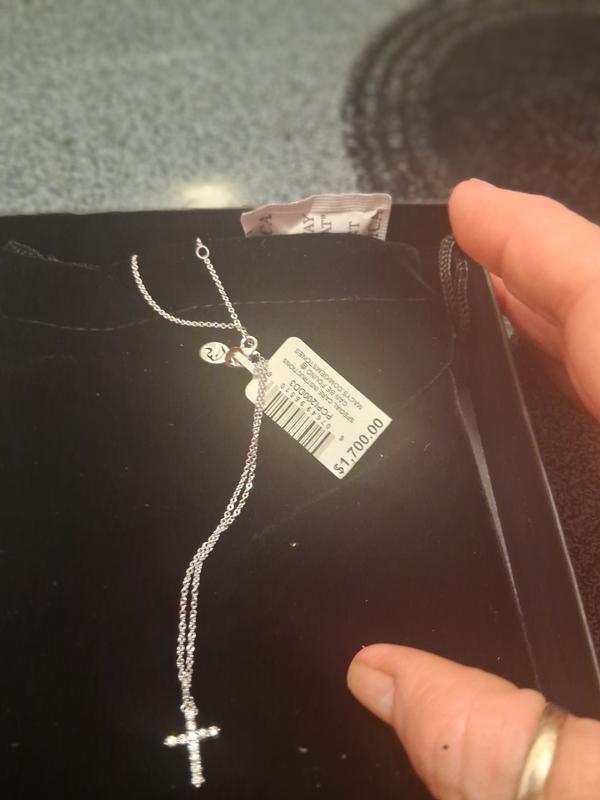 This diamond cross pendant with white gold necklace is absolutely beautiful. The attached picture does not do this product the justice it deserves. The cross is more on the petite size it perfect for anyone looking for a sublet yet stunning piece. The necklace is 18” but includes a link that enables you to shorten it to16”. This item is just as nice as you would expect from Effy jewelry and also comes with a warranty card. Absolutely glad I purchased this item.