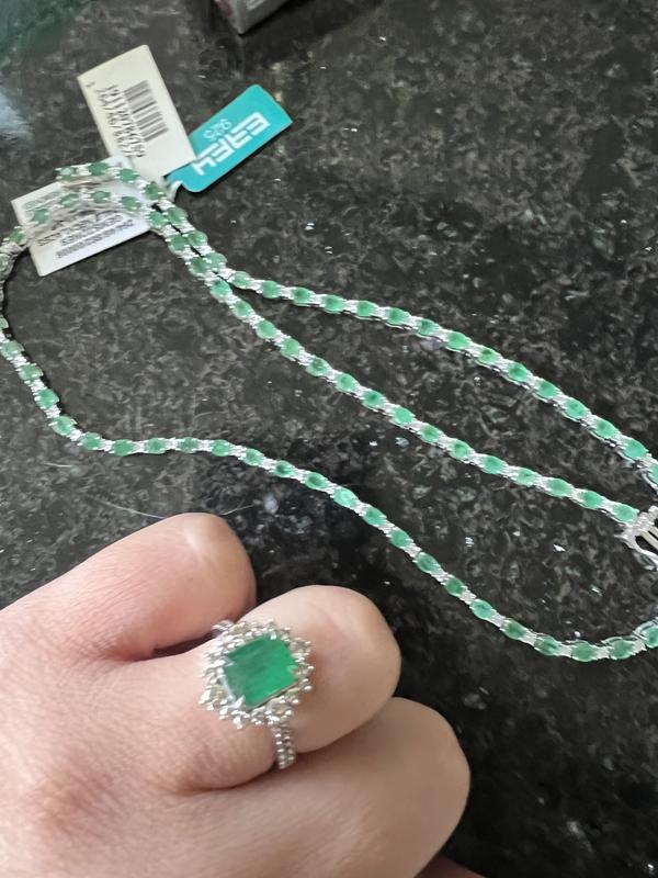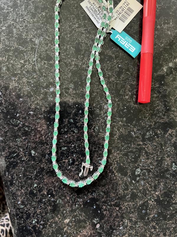 The stones look more like a jade color less like true emerald green. Also the necklace turns on it’s side because it is tall, so the stones don’t stay facing up well and you see sterling silver necklace. Returned. I wanted to keep it, but for the above issues. In the pic the dark background helps make them look darker but when on skin the stones are jade-colored.
