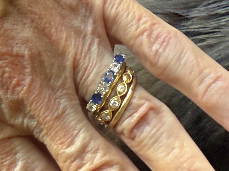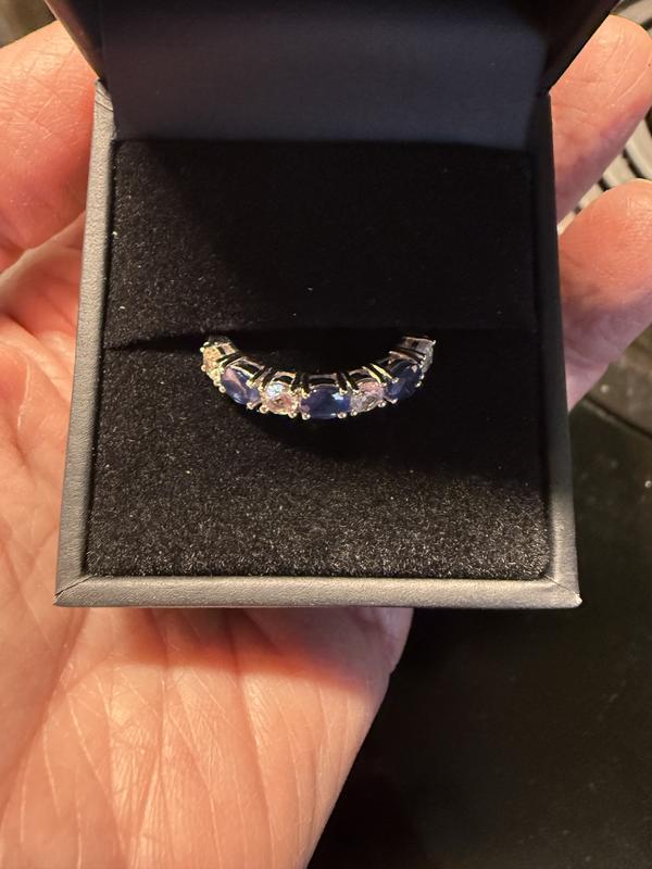 Effy White and Blue ALL Sapphire Band: 4 round White Sapphires with 3 oval Blue Sapphires works pretty well. Works well with stacking. Decent bright blue color sapphires. Kept clean, the white sapphires shine pretty well. Cost saving when white sapphires are used and they look fine. DrawBack: The interior side portions of the shank is hollowed out. This takes away from some strength of the shank. Noticed unfortunately Effy is doing this more & more with bands. Saves them money but costs you band strength. Didn't PASS the sweater test because it has two prongs/areas that snag material. Over-All, fairly happy with the ring on deep discount. Worth a try because Macys makes RETURNs super easy!