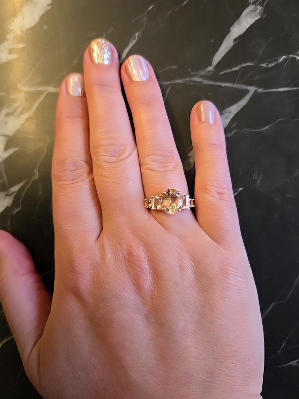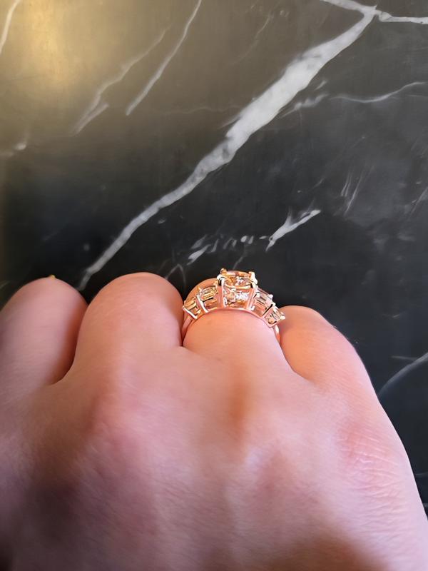 This ring shines almost as much as my 2 CT brilliant cut diamond. The tiny diamonds on the edge are a beautiful detail. Size is perfect. Rose gold compliments the stones perfectly. Love it!