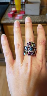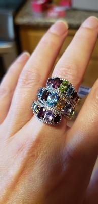 The ring is exceptional. The size is hefty , the sterling is solid and the gemstones are large and sparkling. It is a bit large for my finger so I will get an adjustment adapter to size it. What a purchase! I'm thrilled, it's beautiful.