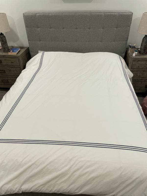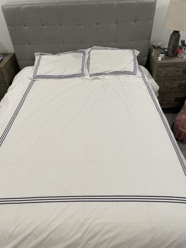 I recently purchased this duvet cover after reading the reviews. It was on sale so I am not too upset about this purchase. The blue trim is not all around, it is not at the top , a little weird so it does not look so good. Not soft enough and wrinkles. I hope that it gets softer with more washes.