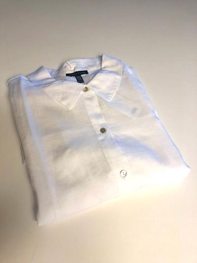I was looking forward to receiving this top in white as it is such a versatile style and color. Unfortunately, I agree with the other reviewers that this top is quite see through and does require a cami or tank underneath. I still would have kept it but it is simply too tight across the bust. I am consistently a size medium in Eileen Fisher and a 36B, and I could not button this without it gaping. I recommend sizing up with this top.