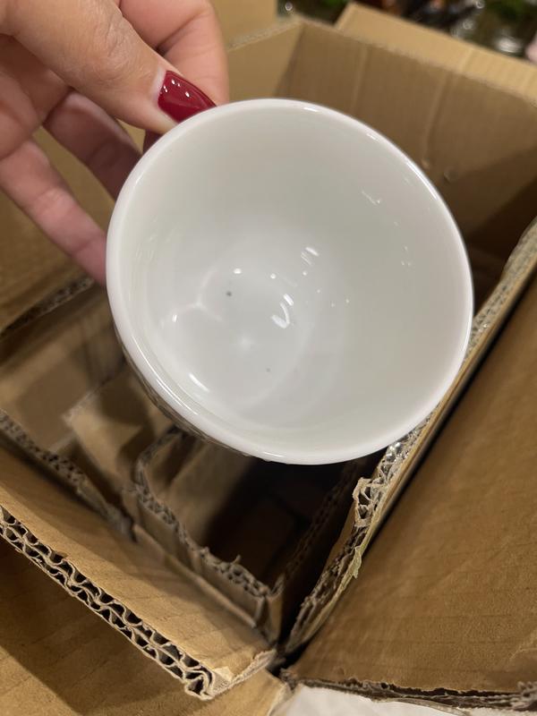 Defects on 1 set. There are black particles baked into the white cup and on the white dish. I teally think the set is adorable, but instead of a set of six, I have a set of 5. Dont want people th I nk I ng they have particles in their cup.