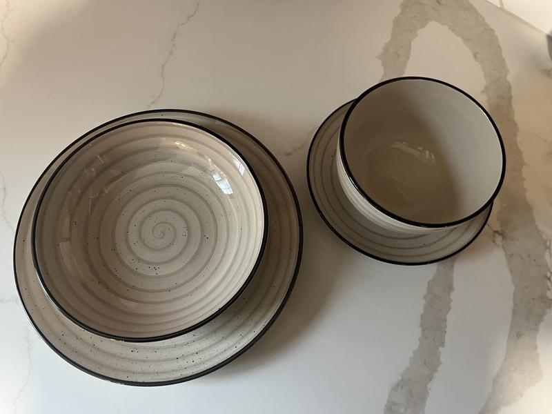 I purchased two sets of these dishes in the cream color, to give me a set of twelve place settings. They are heavy duty, contemporary and classy. I love that the set has two bowl sizes rather than including mugs which I did not need. I am very happy with this purchase. They were packaged and protected very securely and both boxes arrived without any breakage.