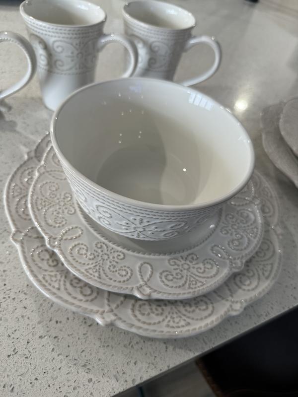 I loved the Lenox French Perle Collection, but not the price. I saw the Elama Luna Embossed Scalloped Dish Set and was very happy to see how much they resemble the Lenox dishes. I purchased 3 sets of the dishes & then waited for the Lenox French Perle accessories to go on sale at Macy’s. I have purchased Platters, Serving Bowls & a Cake Stand and you can’t tell they’re not the same pattern unless you look closely. I have received so many compliments on our Dishes from people of all ages, I’m so happy with this collection!