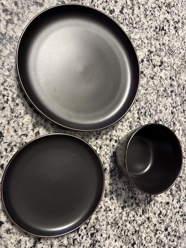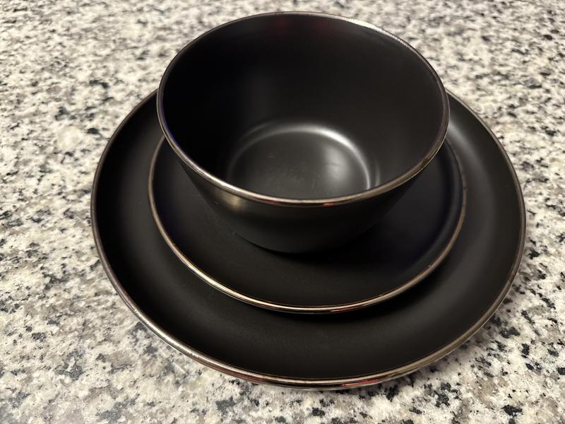 I really like this set. It gives “the look” I am going for with a set table! I’ve washed them by hand and in the dishwasher and no chips or cracks. Also the plates prevent food from running over and the bowls are deep. The black looks really good.