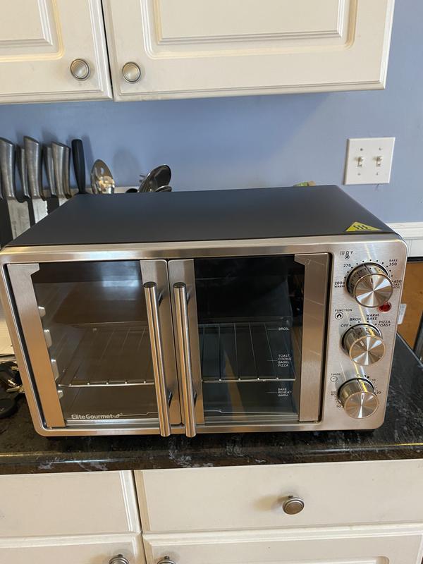 The Elite Gourmet Toaster Oven is nice and I especially like the French Doors. There's nothing digital happening here making it hard to get exact time settings. 16 minutes on this oven's timer took almost 20 minutes. I cooked a frozen pizza in it which turned out better than using a conventional oven. My pizza stick a little bit to the included pan but it was easy to clean. My main issue is the oven is huge making it difficult to find a home for it in my kitchen. There's no preheated indicators at all and the bell used to tell you the oven is done is hard to hear. The plus side is the oven does not turn on until a time is set. This is a nice oven just make sure you have space for it.