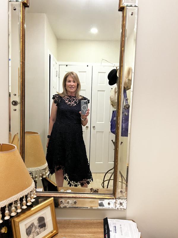 Wearing this as mother of the bride. I’ve looked many places and tried in dozens of dresses and finally found this one in navy. It’s perfect. Love the lace and asymmetrical hem. Fits true to size. So happy with my purchase.
