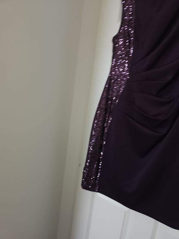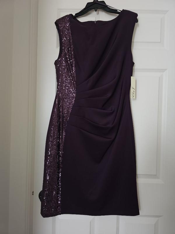 The Eliza J women’s boat neck velvet midi dress is absolutely gorgeous. It’s a deep plum color with sequences going down the right side on the front and there’s also sequences going down the right side on the top part in the back. It zips up the back with a nice zipper. Very comfortable to wear and looks gorgeous on.