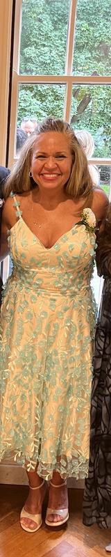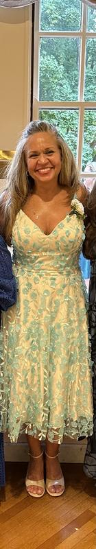 Beautiful beautiful dress!! The color, the fit, the 3 dimensional flowers are exquisite. Wearing this to our nephew's wedding.
