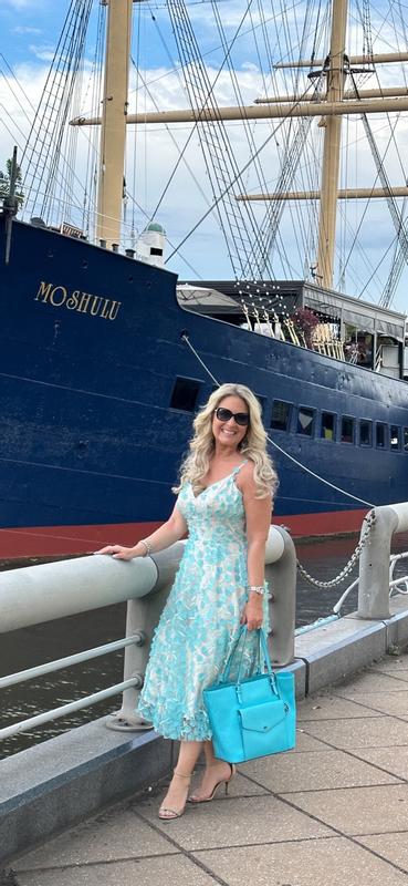 This dress is beautiful! The color is perfect, so feminine and classy. I just wore it for our 26th wedding anniversary as just a touch of my “something blue!”
