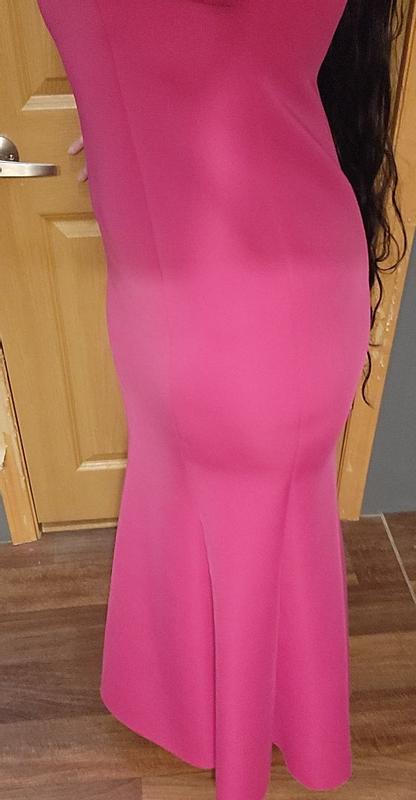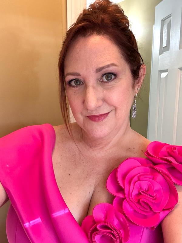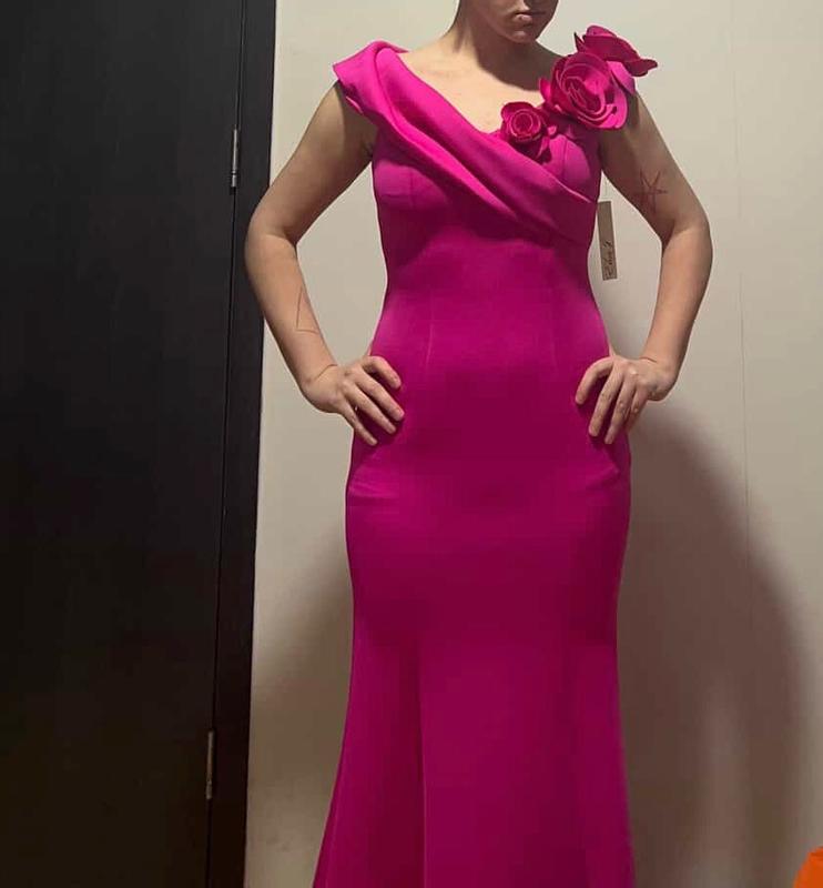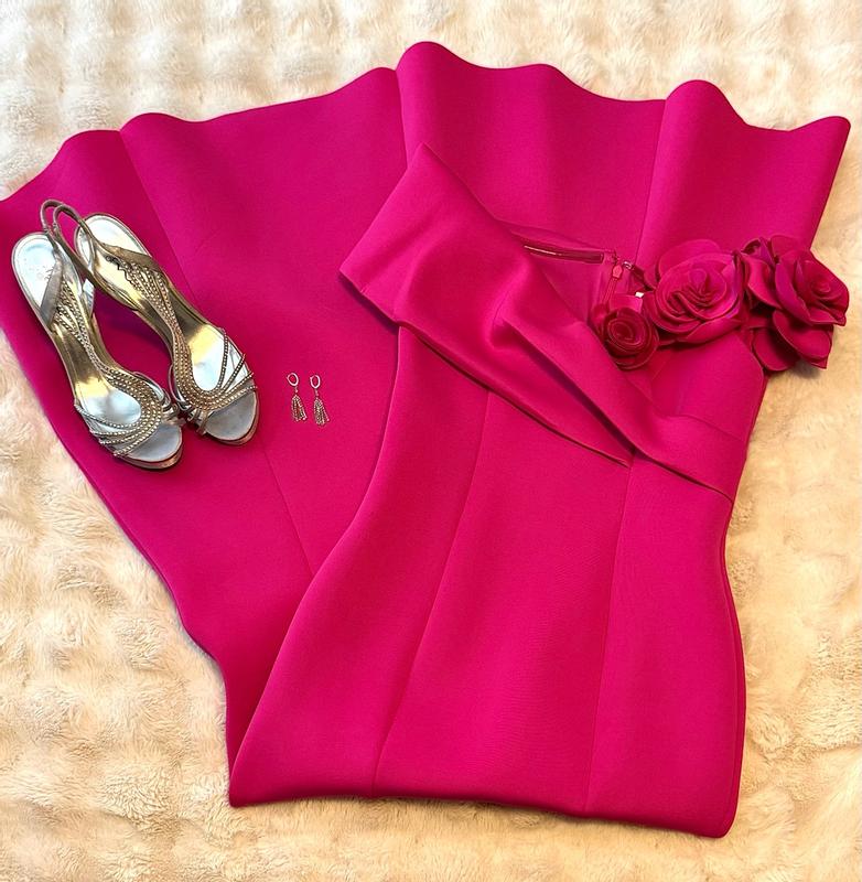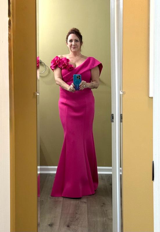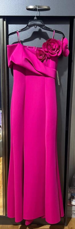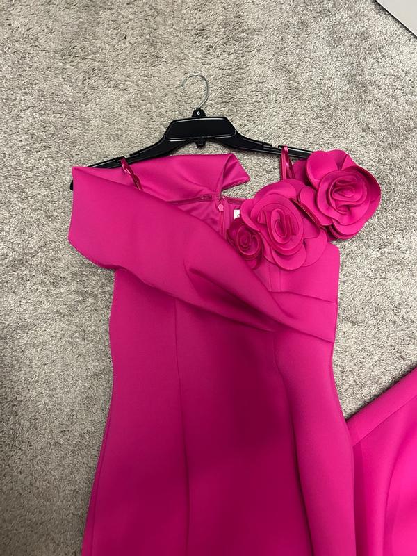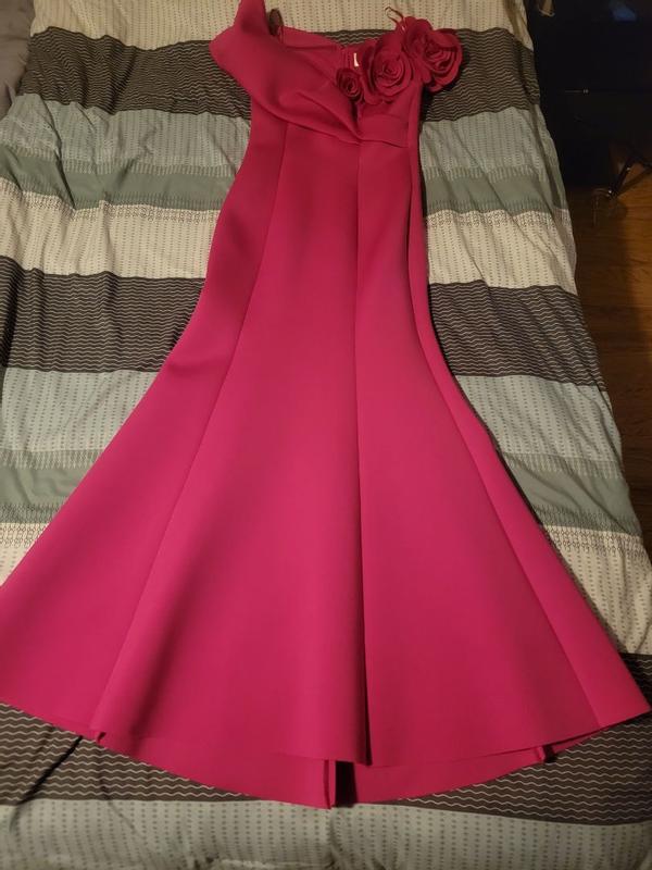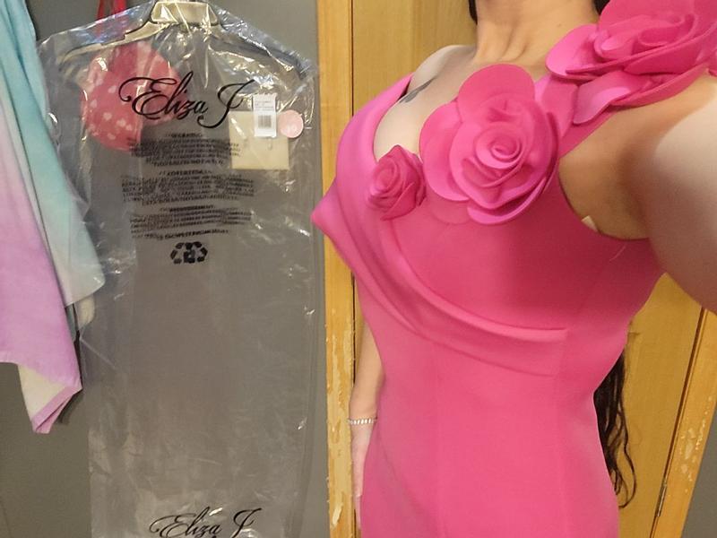 Great dress by Eliza J! Beautiful color magenta pink that would look good on most people in a wonderful scuba diving like fabric that is stretchy enough for multiple body types and thick enough to not be see thru. I love the sweetheart neckline, so flattering with the well made roses on one side and off the shoulder style. The flared hemline also gives you a great shape as well. Can’t wait to wear this out for a formal occasion!
