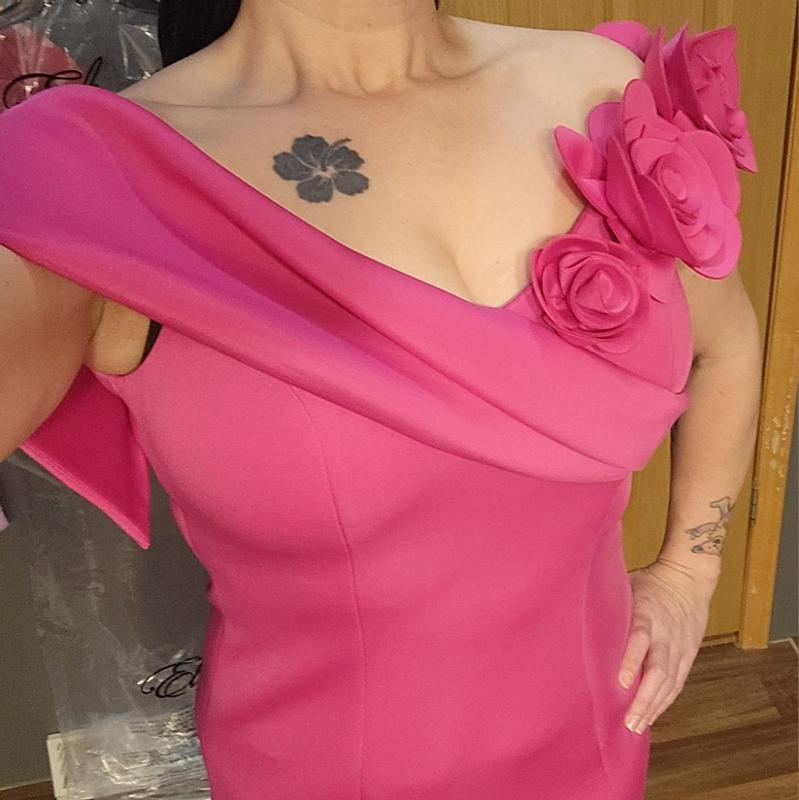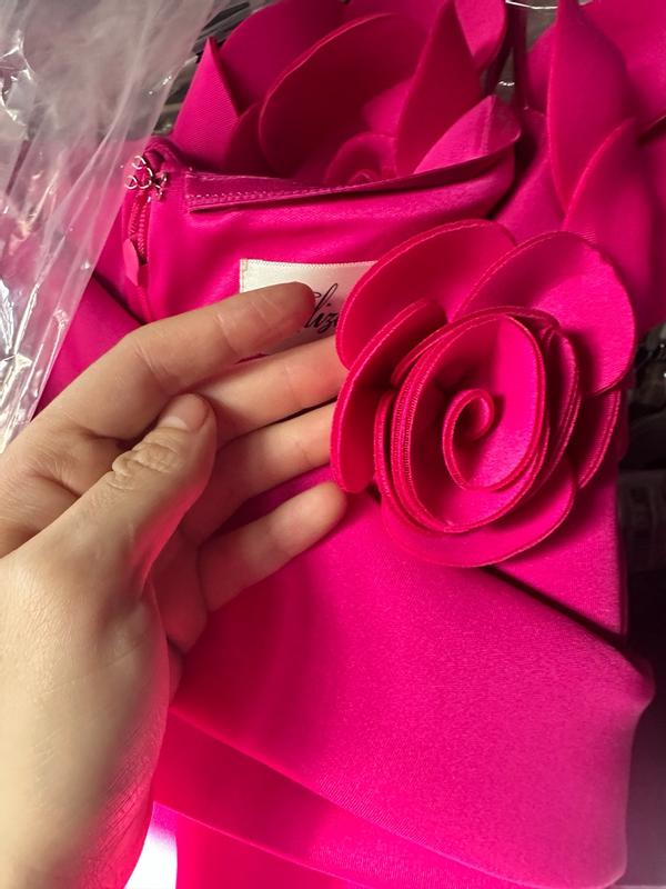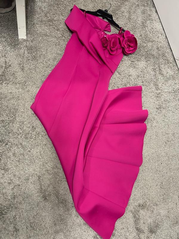 The material feels very thick and well made. It has a nice silhouette and beautiful bright pink color. I would say this would be for a formal event. The only part I was unsure about is the big flower, I would have preferred maybe more small flowers or get rid of the flowers altogether.