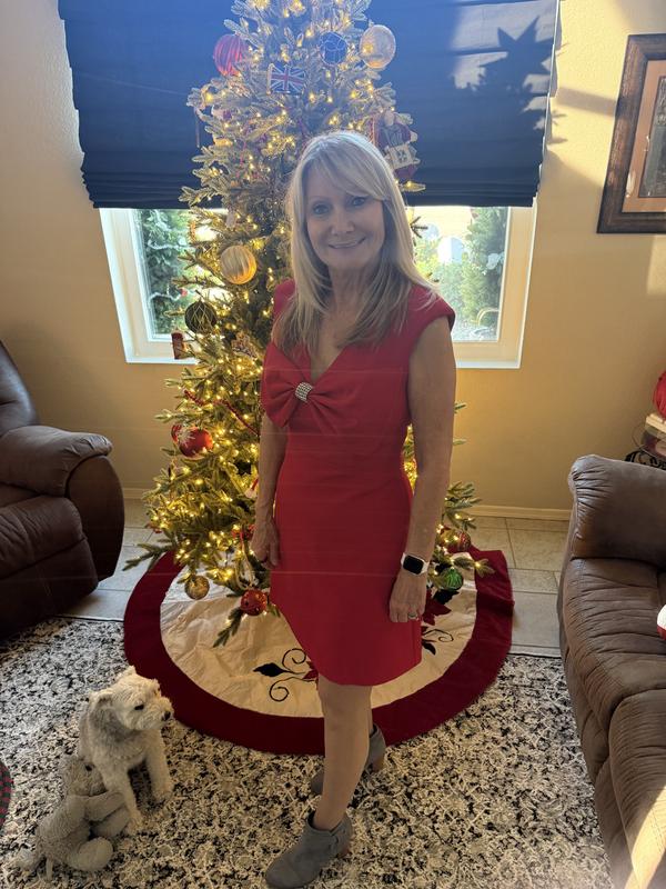 Web ID: 24056108Radiate sophistication in this dress by Eliza J, where a V-neck gently frames the collarbone and the bow detail adds a playful yet refined accent. Its tailored fit enhances your body shape effortlessly while the zippered closure facilitates easy dressing.