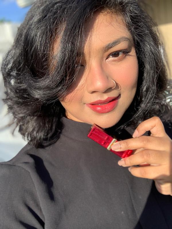 Beautiful tone of red that complements all complexions, very moisturizing and lasting formula.